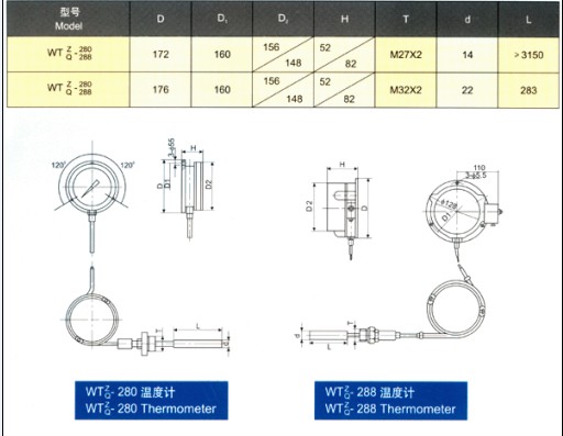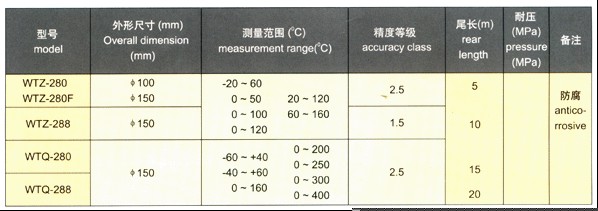 WTZ/WTQ-280/288系列壓力式溫度計(jì)該型號(hào)壓力式溫度計(jì)適用于過(guò)程中較遠(yuǎn)距離的非腐蝕性液體或氣體的測(cè)量,電接點(diǎn)型壓力式溫度計(jì)能在工作溫度達(dá)到和超過(guò)給定值時(shí)發(fā)出電訊號(hào)。