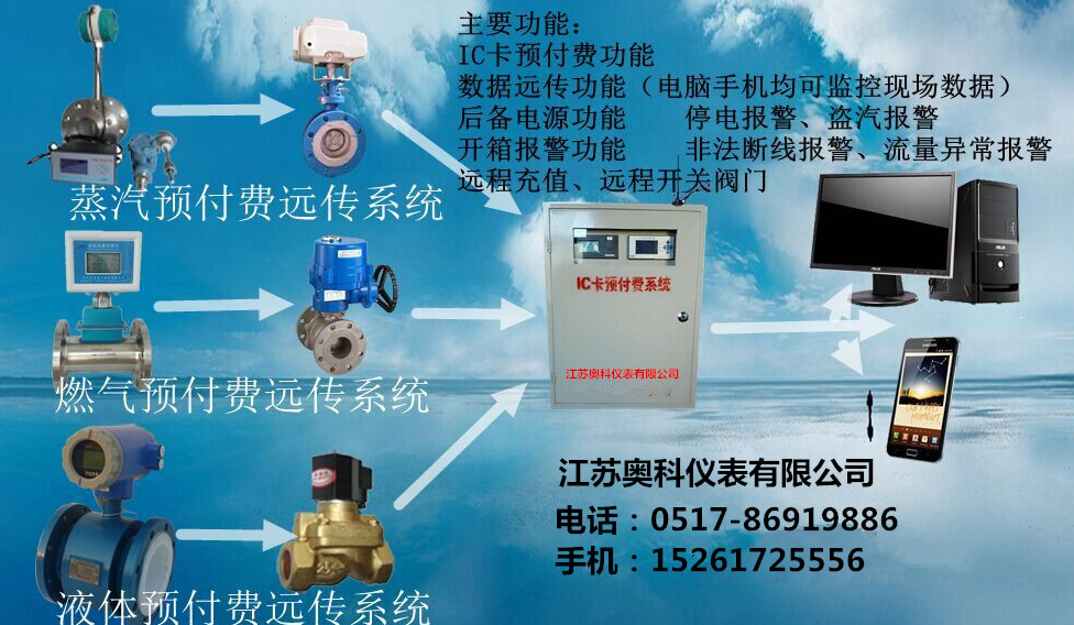 江蘇奧科儀表有限公司完善了一整套具有初級(jí)功能、中級(jí)功能、高及功能的IC卡蒸汽計(jì)量預(yù)收費(fèi)系統(tǒng),蒸汽預(yù)付費(fèi)控制系統(tǒng)解決了企業(yè)以上問(wèn)題,而且由于先充值后用氣,使得供氣企業(yè)提前拿到流動(dòng)資金周轉(zhuǎn),可用于投資或存款利息等,都對(duì)企業(yè)產(chǎn)生了良好的經(jīng)濟(jì)效益。 江蘇奧科儀表有限公司IC卡蒸汽計(jì)量預(yù)收費(fèi)系統(tǒng)適用于各種液體、單一或混合氣體及蒸汽的流量(熱量)顯示、積算、控制;輸入多種流量傳感器信號(hào)(如渦街、渦輪、孔板、V型錐、阿牛巴、熱式等各種流量計(jì))。